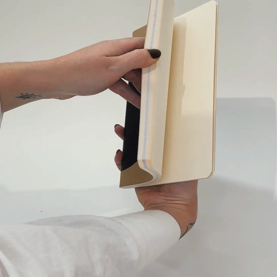 Caderno de capa em papel kraft de gramatura alta, com miolo com 120 páginas pólen soft sem pauta, junto de inserção de folhas de reuso da METRO ARQUITETOS contendo impressões de projetos reais, pequenas anotações e croquis do dia a dia do escritório.